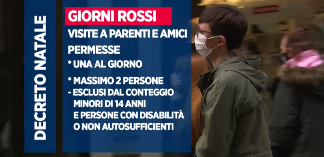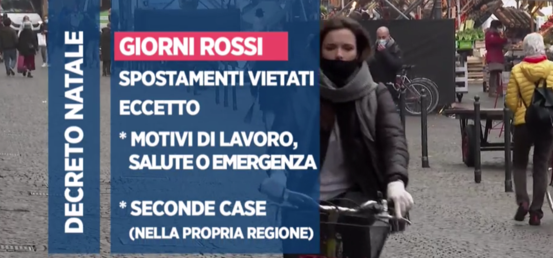 今天12月24号开始全意大利都是红区,一直到1月6号在节假日和节假日早一天期间都是红区,包括周六和周日。从北到南都是一样的规则,一样的限制。检查人们是否有遵守规章的任务将交给7万名警察。