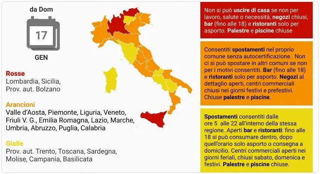 橙区:Abruzzo, Friuli Venezia Giulia, Lazio, Liguria, Marche, Piemonte, Puglia, Umbria , Valle D’Aosta, Calabria, Emilia-Romagna e Veneto.