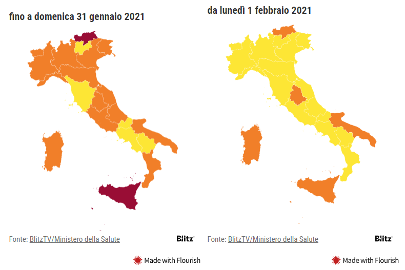 从2月1号星期一开始意大利绝大部分区域都是黄区,红区将会消失。只剩下Umbria大区、Puglia大区、Bolzano自治省、Sicilia、Sardegna大区为橙区。
