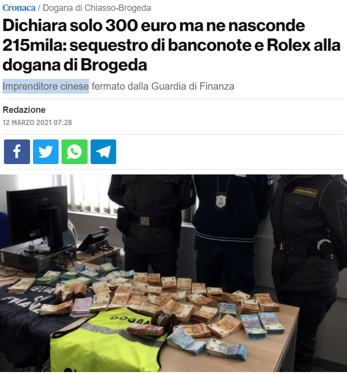 在Brogeda海关,一名意大利这边的21岁华人司机开车前往瑞士,他向海关税警申报自己只有300欧元,但税警并不相信他的说辞。