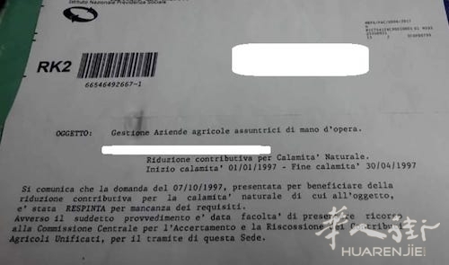 时隔21年后在2018年1月12日农场主意外收到INPS寄来的一份通知书,当他打开信封后竟然发现里面写着他1997年递交的自然灾害减免税务被拒的通告。