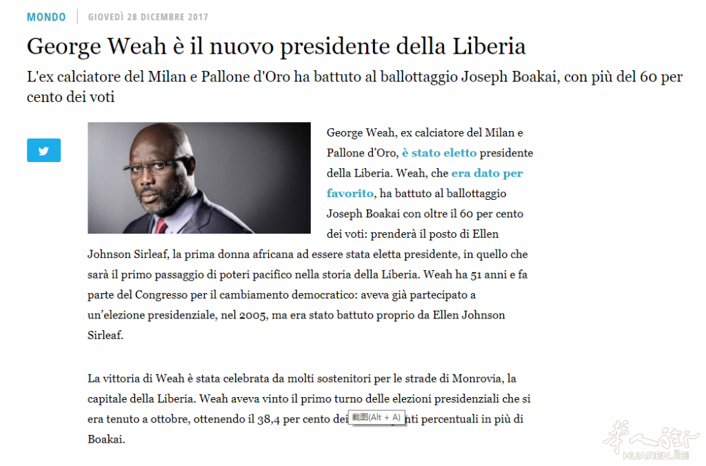新科总统曾效力意甲俱乐部AC米兰,他是前世界足球先生、欧洲足球先生和非洲足球先生,许多人认为其是有史以来最伟大的非洲足球运动员。 维阿参加2005年利比里亚总统大选,惟在第二轮投票以40.6%对59.4%败于埃伦·约翰逊·瑟利夫。2017年利比里亚大选中获得胜利,成为第一位出身于足球运动员的总统。