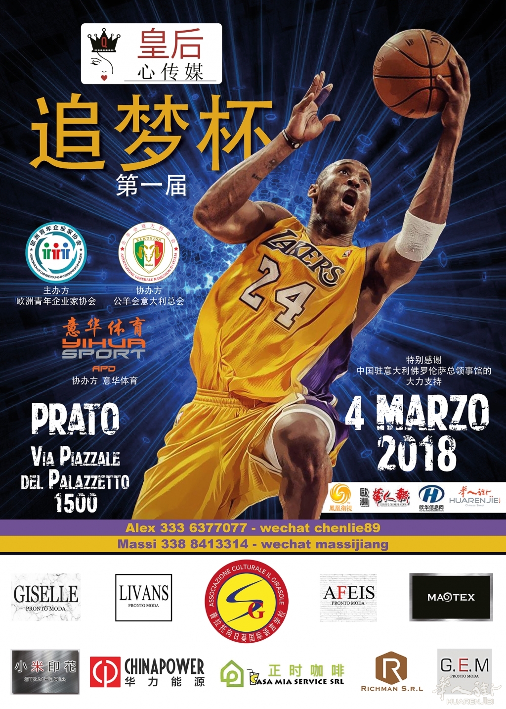 意华体育3月4日举行皇后心.追梦杯首届篮球赛 2018-01-23 来源:意大利华人街 阅读: 意大利《华人街》消息:为了丰富旅欧华人与学生们的业余生活,进一步推动体育活动开展,带动体育活动的风气,在强身健体的同时增强凝聚力,加强旅欧华商与华裔学生之间的沟通与交流,也给大家展示自我的舞台,在中国驻佛罗伦萨总领馆的大力支持下,在各兄弟侨团的积极配合下,欧洲青年企业家协会决定于 2018年3月4日在意大利普拉托隆重举行“皇后心.追梦杯篮球赛”,展示出新时代华人的蓬勃朝气和竞技热情,促进华人更好的融入当地社会。 主办单位:欧洲青年企业家协会 协办单位:公羊会意大利总会 意华体育 比赛地点:Via Piazzale del Palazzetto 1500, PRATO ITALY 希望参加球赛的队伍尽快报名,并祝愿赛出好成绩! 联系人: Alex 3336377077 - wechat chenlie89 Massi 3388413314 - wechat massijiang 友谊第一 比赛第二 为正常使用来必力评论功能请激活JavaScript 麦吉丽 净夫人 艺美佳医学微整 罗马新东方花行 曾在火车上歧视言语辱骂和殴打华人的2名青少年被控... 意大利华人街(微信订阅号:huaren...上一篇 意大利又有2人因流感死亡... 意大利流感严重,近日帕维亚市(...下一篇 广告 BLUDATI 事业会计所 米兰办公室可直接办理公证手续(NOTAIO)!(广告)