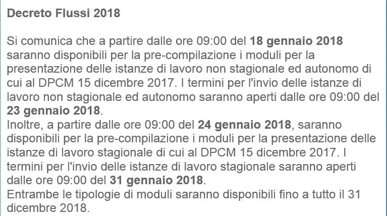 据意大利informazionefiscale.it网站消息,此次劳工申请自主和非季节性移民劳工申请发送时间从2018年1月23日9时开始;季节性移民劳工申请发送时间从2018年1月31日9时开始。
