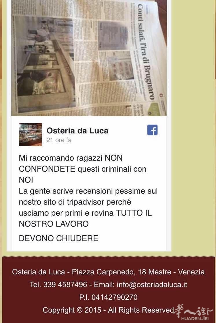 事情到昨天发生了戏剧性的变化,街友(jk_hqNl0)发帖挖出这家餐馆是华人开的,为了慎重起见,华人街编译组查询了多重资料,发现同名字的餐馆在mestre还有一家,但是这家餐馆于日前在自己的官网上晒出:我不是卖天价午餐的那家餐馆。