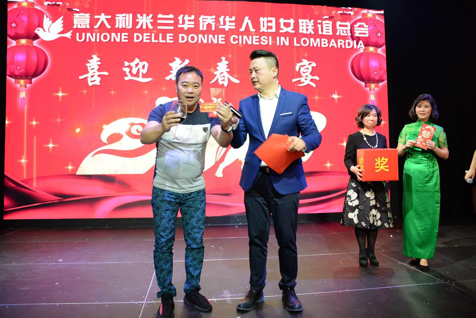 会议结束后,紧接着娱乐文艺节目就开始了。陈银燕会长和两位名誉会长赵小敏、吴小玲的散文朗诵拉开了迎新春晚会的序幕,三位会长和执行会长余小叶、第一常务副会长林剑秋、理事长周肖萍、秘书长陈黎等人一起上台给现场嘉宾拜年。迎新春晚会由秘书长陈黎女士和米兰知名主持人车伟先生一起主持,抽奖活动和文艺演出穿插进行,让整台迎新春晚会扣人心弦,精彩纷呈。