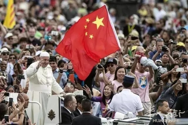 ▲2016年6月,圣彼得广场上,有人在教皇方济各身畔挥舞着中国国旗(图片来源:《纽约时报》网站)