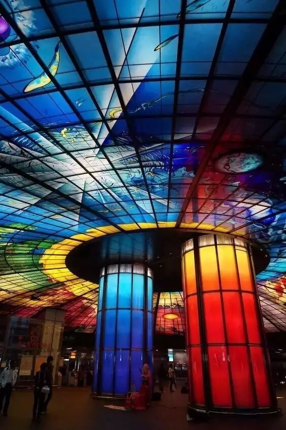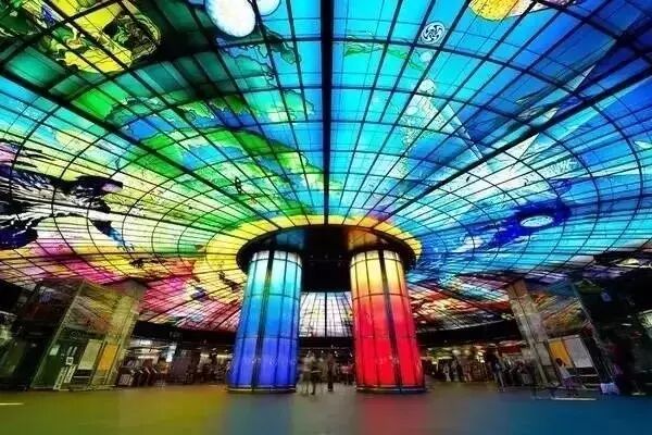 位于台湾高雄的美丽岛站正如它的名字一般充满吸引力。站内的“光之穹顶”由人称“水仙大师”的意大利艺术家Narcissus Quagliata打造,耗时近四年,使用了四千多块彩色玻璃。这件全世界最大的单件玻璃艺术品的设计理念结合了人民的美好祝愿和神秘的自然,展现了浩瀚宇宙中的万物荣枯,一蓝一红两根柱子亦体现了阴阳两极的文化概念。