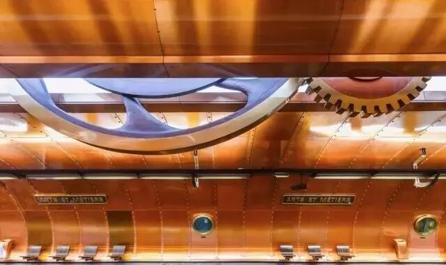 Arts et Métiers 翻译出来就是「艺术与工艺品车站」。独树一帜的蒸汽朋克风格,来自于1994年比利时连环画家 François Schuiten 。地铁站内采用了大量潜艇窗口、铆钉装饰和暖色金属,风格独特。