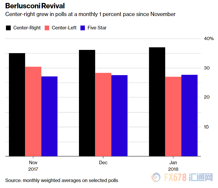 彭博计算的1月民调平均数显示,意大利中右翼政党获得37%的选票,中左翼政党27%,五星运动党27.7%。