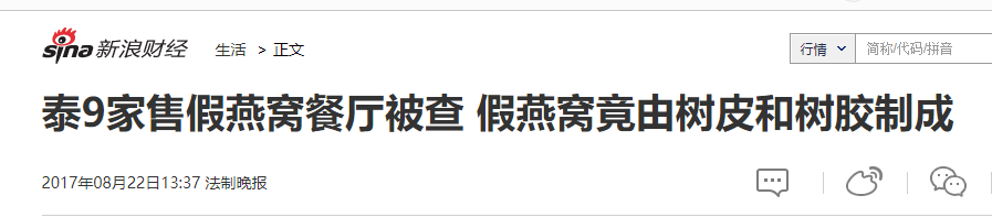 从2017年8月份开始,泰国卫生部对多家燕窝销售点进行了暗访调查,结果一下查出9家经营点居然将树皮,树胶熬成假“燕窝”,