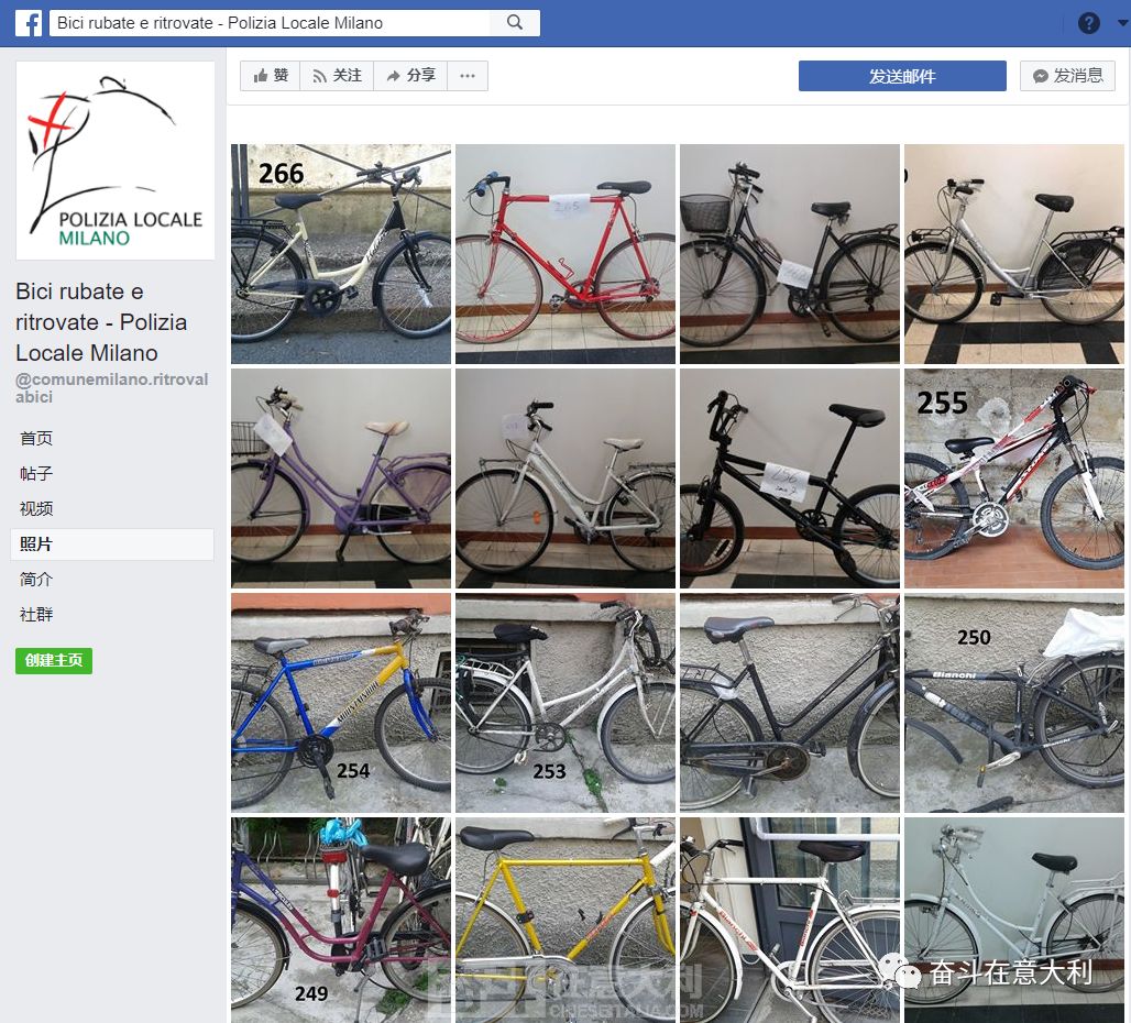 警方目前正在对被盗自行车进行拍照,将尽快传送到米兰当地警察(Polizia locale Milano)的脸书上共失主认领。(奋斗在意大利)