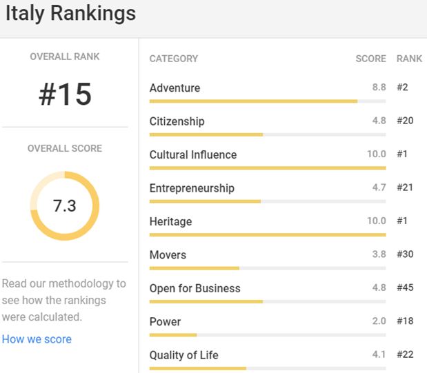 此外,意大利在“国家活力”一项中也取得了世界第二的好成绩,仅次于巴西之后。优美的自然景色,宜人的气候以及热情的人民,让意大利长期以来一直都是各国游客热衷的旅游胜地。