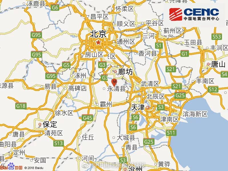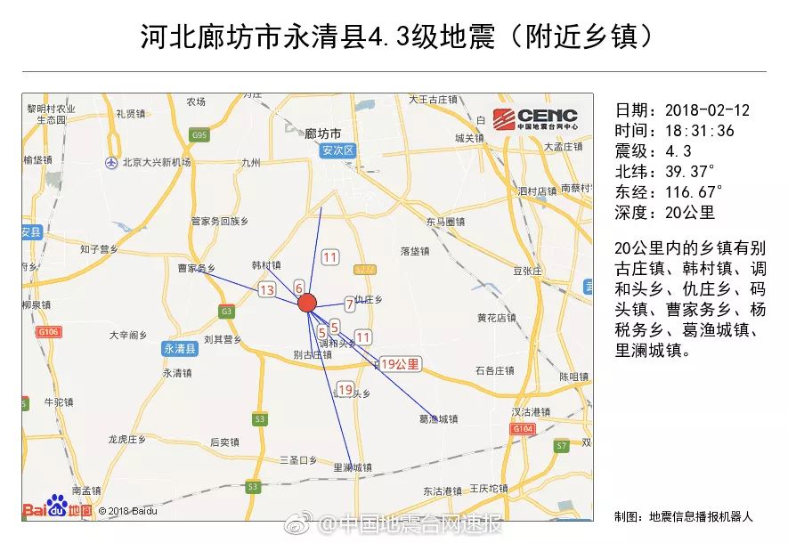 中国地震台网正式测定:02月12日18时31分在河北廊坊市永清县(北纬39.37度,东经116.67度)发生4.3级地震,震源深度20千米。