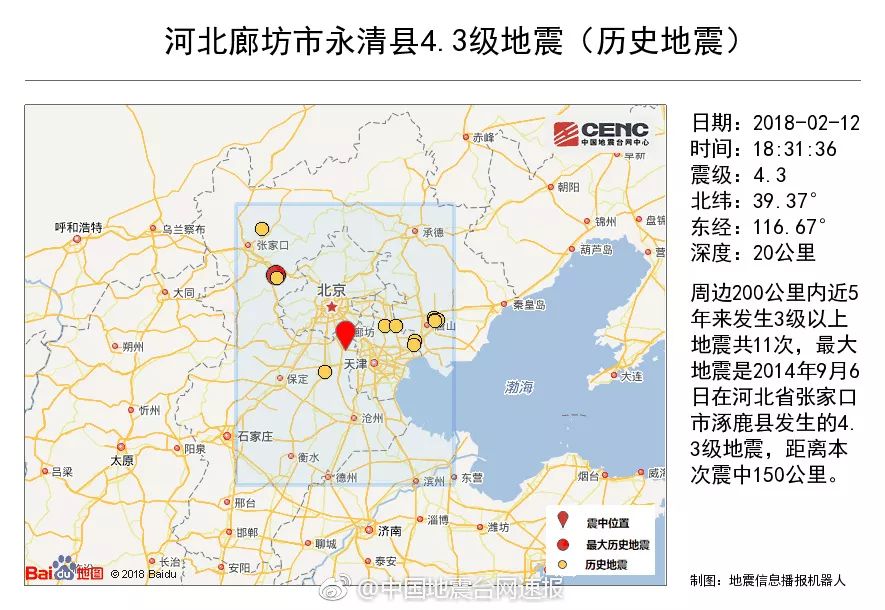 震中周边200公里内近5年来发生3级以上地震共11次,最大地震是2014年9月6日在河北省张家口市涿鹿县发生的4.3级地震(距离本次震中150公里),历史地震分布如图。