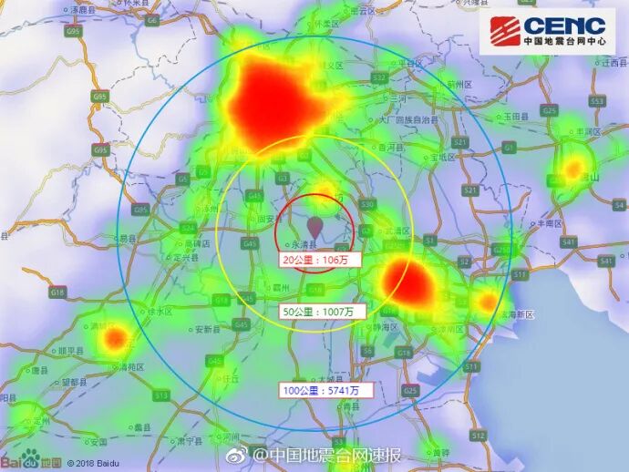震中周边人口密集,有感范围较大,震中距离北京城区约65公里。据移动人口大数据分析,震中20公里范围内人口数约106万,50公里范围内约1007万,100公里范围内约5741万。