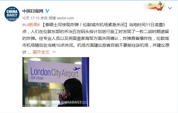 【泰晤士河惊现炸弹!伦敦城市机场紧急关闭】当地时间11日凌晨5点,人们在伦敦东部的乔治五世码头按计划进行施工时发现了一枚二战时期遗留的炸弹。经专业人员以及英国皇家海军方面共同确认,炸弹具备爆炸性,伦敦城市机场随后在当晚10点关闭。机场方面建议旅客目前不要前往该机场,并建议原计划12日从该机场搭乘飞机的乘客联系航空公司询问最新消息。警方表示,他们正在与皇家海军共同努力拆除这枚炸弹。