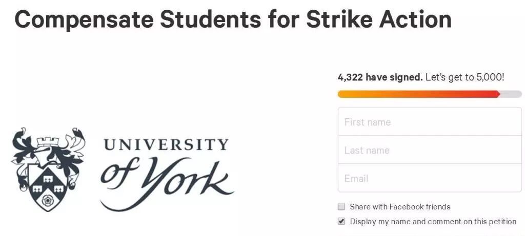 约克大学请愿书:本学期课时20周,相当于100天,学费大约9000镑。而罢工两星期,即14日期间,学生白交了1295镑学费。国际学生的损失,更远远不止于此。300英镑是我们应该获得的最起码的赔偿。