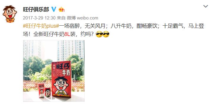 这还不算最可怕的,2017 年愚人节前夕,旺旺突然发布了一张8L装牛奶。就在大家都以为这是愚人节玩笑时,这桶大旺仔真的上市了,同时还搭配了一款 8L马克杯一起售卖。简直一人我饮奶醉。