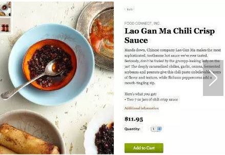 早在2012年,“老干妈”就入驻了美国奢侈品电商Gilt,成为了奢侈品!价钱当然是高得惊人,在一次类似于'双十一'这样的打折季中,限时抢购价也要11.95美元两瓶(约人民币37元一瓶)。