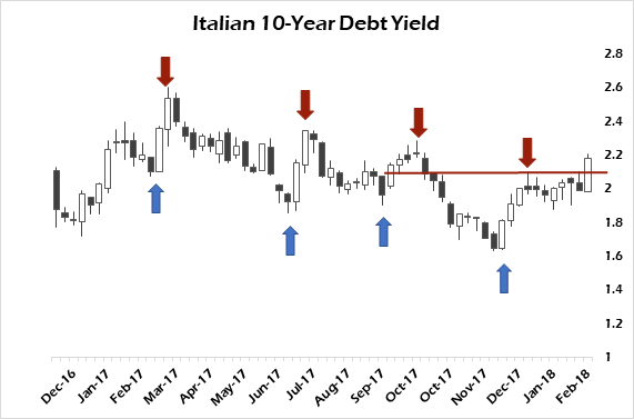 在上周的5个交易日,该债券收益率涨幅多达20个基点,周线涨幅约为今年以来最大。意大利国债收益率已经突破了2.1%这一关键阻力位。意大利债券市场很不被看好,使得该国债券与同期德国国债收益率息差达到150个基点以上,创1月底以来最大。
