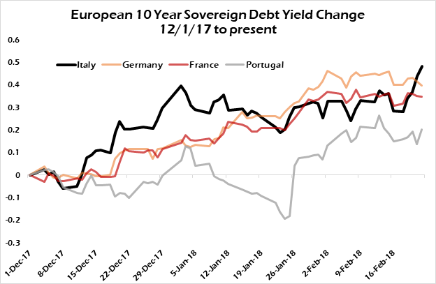 综合上海华尔街见闻、香港FX168财经报社报道,自去年12月初以来,欧洲国债收益率全线攀升,意大利国债近期更是收益率暴涨,价格狂跌。