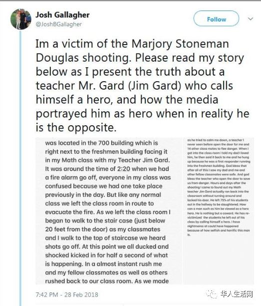 名叫加拉格尔的一名高中生首先在推特上(28日),将自己那天亲身经历的过程全部告诉大家。2月14日,校园内枪声响起,佳德却跑进教室,并锁上门,“将75%的学生关在外面”,自顾自躲了起来。