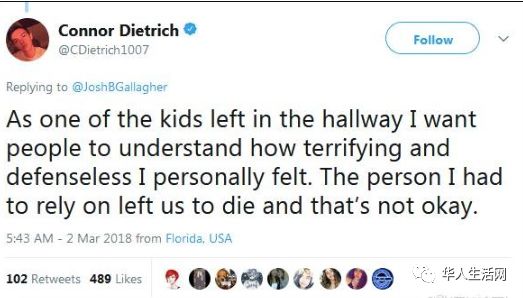 无独有偶,加拉格尔的发言,让同班同学迪特里克感同身受。后者在推特上转发了加拉格尔的推文,并说道:“作为被遗留在走廊上的学生之一,我只想告诉大家当时我们有多害怕,多无助。在那种情况下,我指望老师,他却让我们自生自灭,这很不OK。”