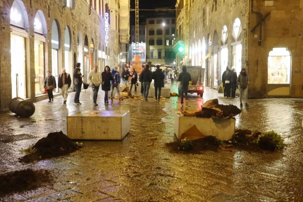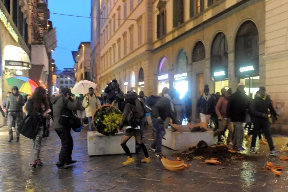 当队伍通过Via Cerretani街时,有人甚至开始推倒街边停放的摩托车。此外,主教座堂广场(Piazza del Duomo)附近的一些建筑工地的围挡设施也遭到了破坏。