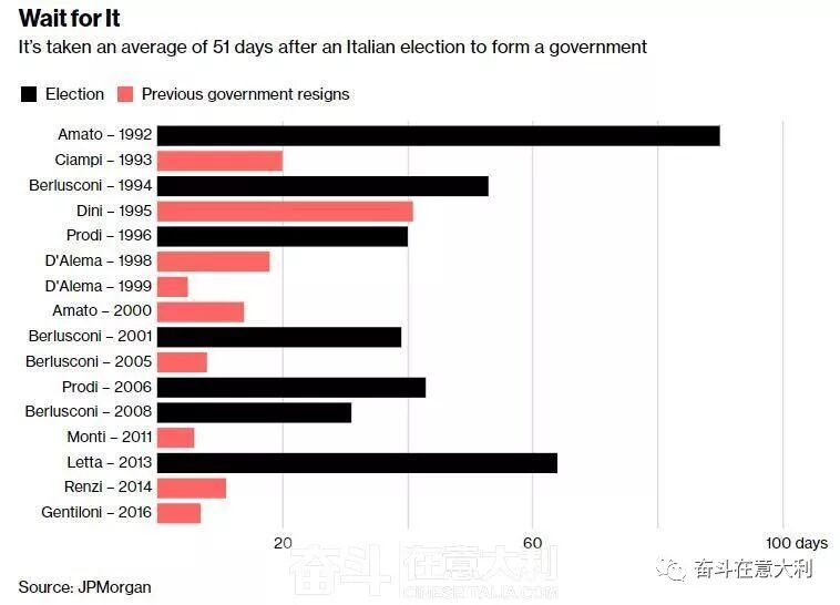 华人头条3月8日米兰电 据奋斗在意大利报道,根据摩根大通(JPMorgan Chase&Co.)发布的数据显示,历史上意大利大选后组建新政府,平均需要51天的时间。最长的记录由意大利前总理Giuliano Amato创造,当时新政府的组建谈判耗时长达90天。