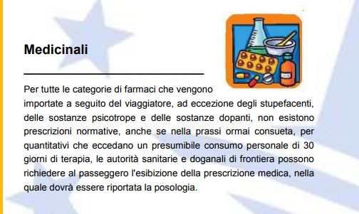 除麻醉类、精神类和兴奋剂类以外的药品,意大利海关对于旅客携带的药品尚无明确监管要求。不过,如果药品超过30天的个人用量,边防卫生局和海关可能会要求旅客出示医生处方并报告剂量。