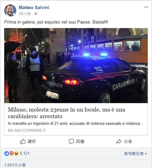紧接着,米兰发生了类似骚扰事件后,他又在Facebook上又愤怒地说到:“先送到监狱,然后驱逐出境。就得了!”