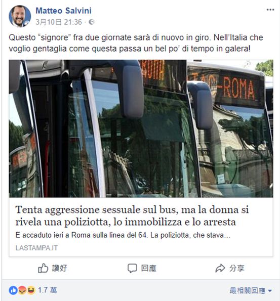 3月10日,联盟党的主席萨尔维尼(Salvini)就罗马性骚扰案在社交媒体脸书(Facebook)发言说: “这位‘先生’没过两天就会放出来,我希望在意大利这样的暴徒能够在监狱里待久一点。”