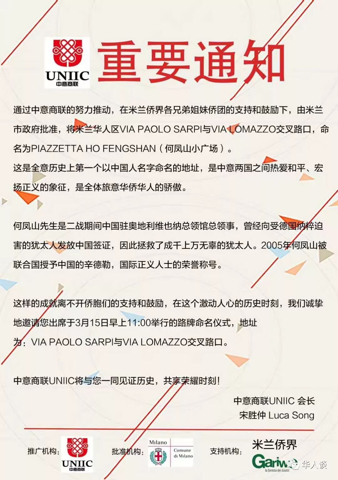 这是全意大利历史上第一个以中国人名字命名的地址,在这个历史性的一幕,希望我们所有的华人同胞能够共享喜悦、传递真情!一起去见证这个神圣而又庄严的时刻!