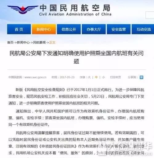 2017年5月23日,民航局官网还专门发文对此进行了辟谣说明。官网上“民航局公安局下发通知明确使用护照乘坐国内航班有关问题”中说,中华人民共和国护照可以作为有效乘机身份证件,办理国内航班购票、值机、安检手续;旅客乘坐国内航班,办理购票、值机、安检手续时,应当使用同一个有效乘机身份证件。
