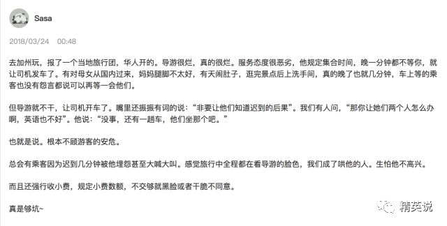 去加州玩,报了一个当地旅行团,华人开的。导游很烂,真的很烂。服务态度很恶劣,他规定集合时间,晚一分钟都不等你,就让司机发车了。有对母女从国内过来,妈妈腿脚不太好,有天闹肚子,逛完景点后上洗手间,真的晚了也就几分钟,车上等的乘客也没有怨言都说可以再等一会他们。