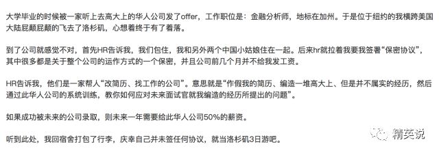 HR告诉我,他们是一家帮人“改简历、找工作的公司”。意思就是“作假我的简历、编造一堆高大上、但是并不属实的经历,然后通过此华人公司的系统训练,教你如何应对未来面试官就我编造的经历所提出的问题”。