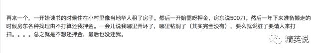 一开始读书的时候住在小村里像当地华人租了房子。然后一开始需要押金,房东说500刀。然后一年下来准备搬走的时候房东各种找理由不打算还我押金。一会儿说我哪里弄坏了,哪里钻洞了(其实完全没有),要么就说脏了要请人来打扫...... 总之就是不想还押金,最后也没还我。