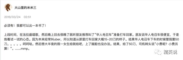 结果华人电召车下车的时候管我要50刀...... 呵呵哒。然后想大半夜的我一女生给就给吧,上了贼船也没办法。结果,给了50刀,司机转头说“小费呢?小费另算!”。....... mmp。
