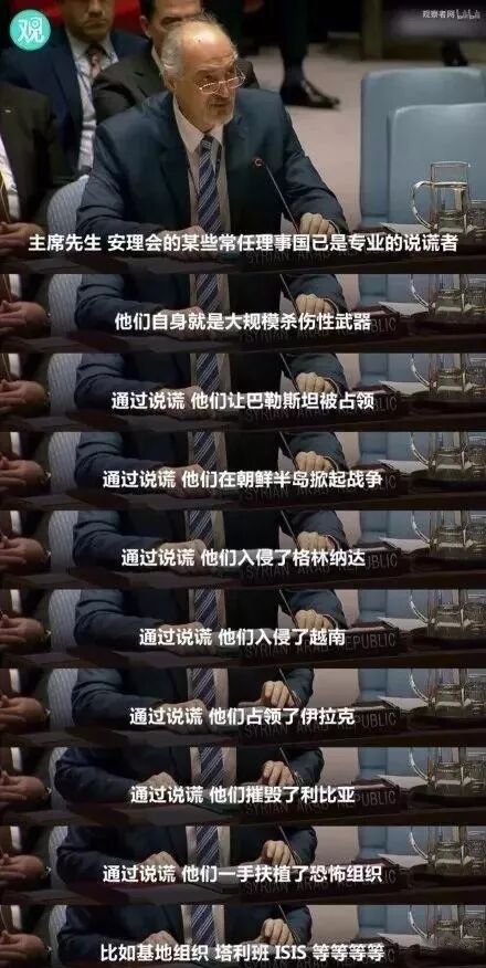 4月9日巴沙尔·贾法里在安理会上痛斥美英法严重污蔑叙利亚,13日他有理有据的为自己国家伸冤。
