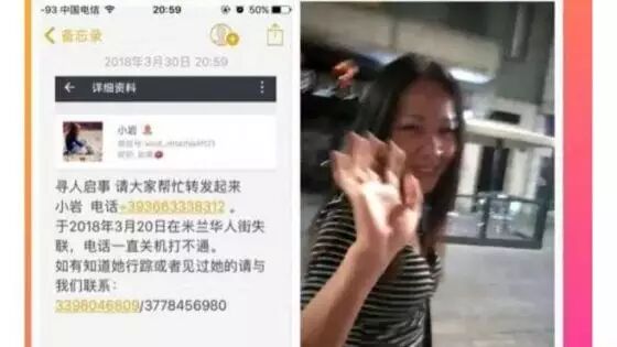 于4月9日在皮亚琴察市(Piacenza)失踪的18岁少女如今已被找到。然而一波刚平一波又起,意大利媒体近日再爆出米兰又有一名华人女子失踪。失踪女子在中国的家属发出公告,“如有知情者,请联系警方。”