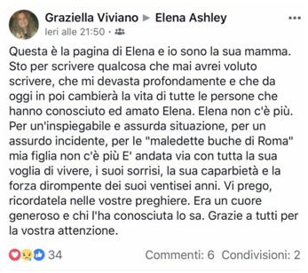 “我要说一些我永远都不想说的话,(女儿的死亡)深深地摧毁了我,从今天开始,所有认识她、喜爱她的人的生活都将改变。女儿不在了。因为一个无法解释、荒唐的原因,因为一场荒唐的意外,因为‘罗马公路上万恶的坑’,我的女儿不在了。她带着想要继续生活的意愿、她的笑容、她的固执、她26岁生命的强大力量,不甘心地死去了。我请求你们不要忘记为她祈祷,她是一个心胸宽广的人,所有认识她的人都了解。感谢所有人的关心。”这位母亲这样表示。