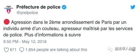 法国内政部长科隆发推文表示,警察快速行动制服了袭击者。