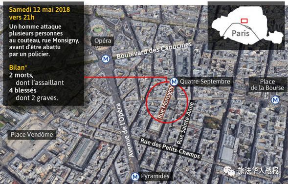 巴黎5月13日电(鲁佳)5月12日周六晚21时许,巴黎市中心歌剧院附近蒙西尼街(Rue Monsigny)发生持刀袭击事件,一名男子持刀随意袭击路人,导致至少一人死亡,四人受伤,其中两人伤势严重。袭击者已被警方击毙,但尚未确认身份和动机。