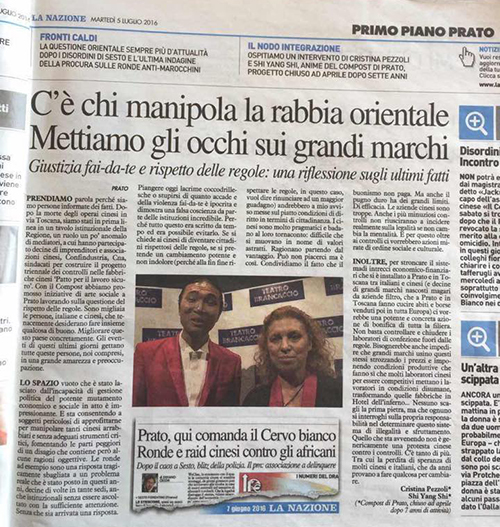 今天滴几滴鳄鱼的眼泪或是对所发生之事表示诧异是非常虚伪的,只能证明意方政府机构对问题的虚假意识。因为这些问题一直被向上反应,而且悲剧本来是可以被避免的。如果想要求中国国民遵守规则,如果想得到巨大并有代价的改变(遵守规则目前意味着放弃更多的利润),那么我认为就应该明确向华人提供出作为一个公民相应的权益条件。我是意大利人,我眼中的中国人很实际,非常在乎自己的切身利益,他们难以依照抽象的价值观去做事情。他们首先从思考如何可以得到好处为出发点。也许不是每个意大利人都能欣赏这种态度,但这就是普拉托的实情。三十年来意大利左派的“假好人的亲华主意”没得来好处,但最近今年的“拳头主意”也不能保证有效。中国企业太多了,如果所有企业家不群体改变观念的话,即使意大利方面的检查再细致也无法改变这些企业的合法性。也就是出于这个原因,除了检查之外,我们更需要能够改善社会秩序和文化和谐氛围的建设性工作。