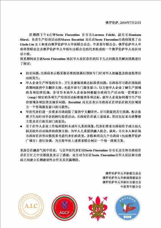 接见期间双方就Sesto Fiorentino地区华人社区存在的以下几点问题及其解决措施进行了探讨:
