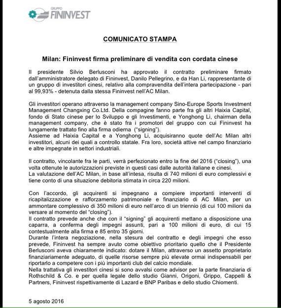 凤凰体育讯北京时间8月5日,AC米兰俱乐部主席贝卢斯科尼旗下的Fininvest财团官方发表声明,他们与来自中国的财团就俱乐部转让已经达成协议,中国财团将以7.4亿欧元收购米兰99.93%的股份。从去年3月份开始,米兰就与中国资本传出绯闻,今天,这部长达1年半的肥皂剧终于终结。AC米兰的买家是“中欧体育投资管理长兴有限公司”投资者包括海峡汇富产业投资基金(HAIXIA CAP)、国家开发投资公司(SDIC)和Yonghong Li;买家将在三年里向俱乐部投资3.5亿欧元。
