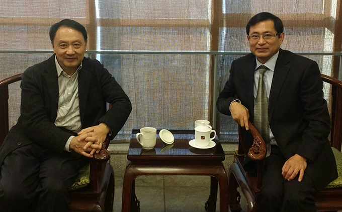 王明明先生2016年在北京画院与欧洲新闻社蒋明总编辑亲切交谈。