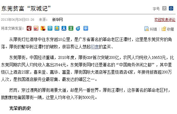 从厚街灯红酒绿中往东穿越10公里,是广东省著名的革命老区汪潭村,这里是东莞贫穷的角落。厚街的繁华到汪潭村的破败,很容易让人想起印度的孟买、