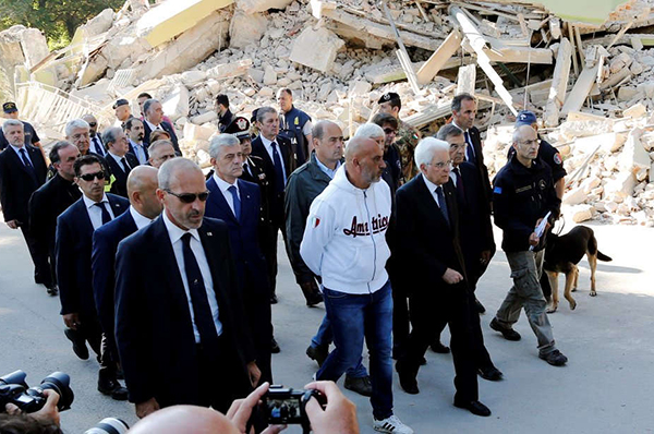 意大利总统塞尔焦•马塔雷拉(Sergio Mattarella)及其他官员抵达地震重灾区阿马特里切(Amatrice)